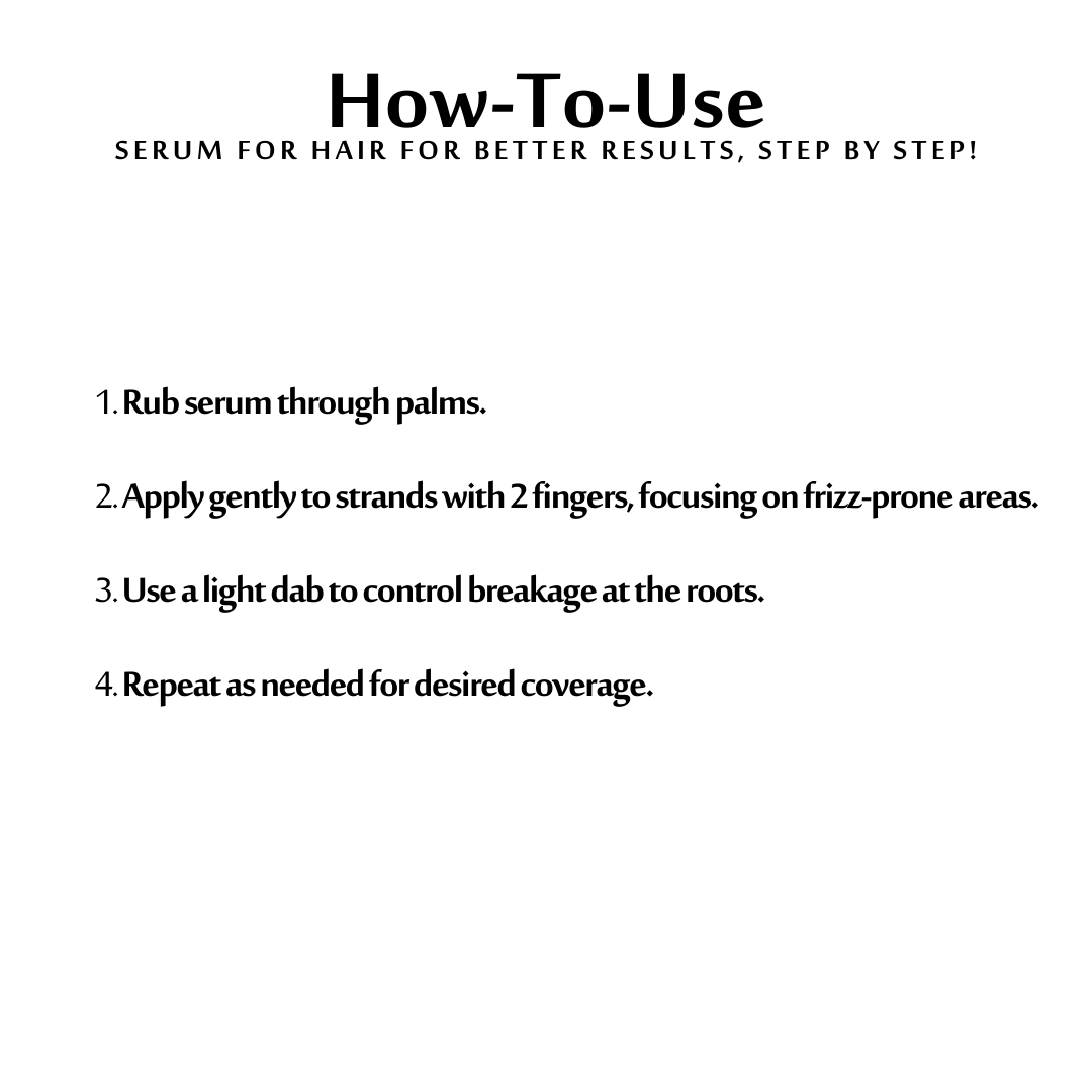 Apply 2-3 drops of serum to clean, towel-dried hair. Rub the serum between your palms and then distribute it evenly throughout the hair, focusing on ends and dry areas. Comb through and style as desired. For best results, use consistently.
